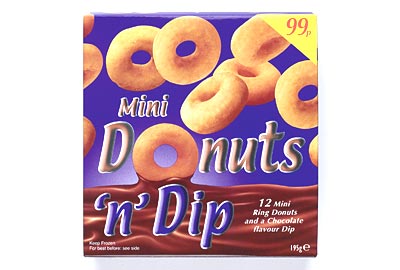 A pack containing 12 mini ring donuts and a chocolate flavour dip. Can be heated in a microwave from frozen.
